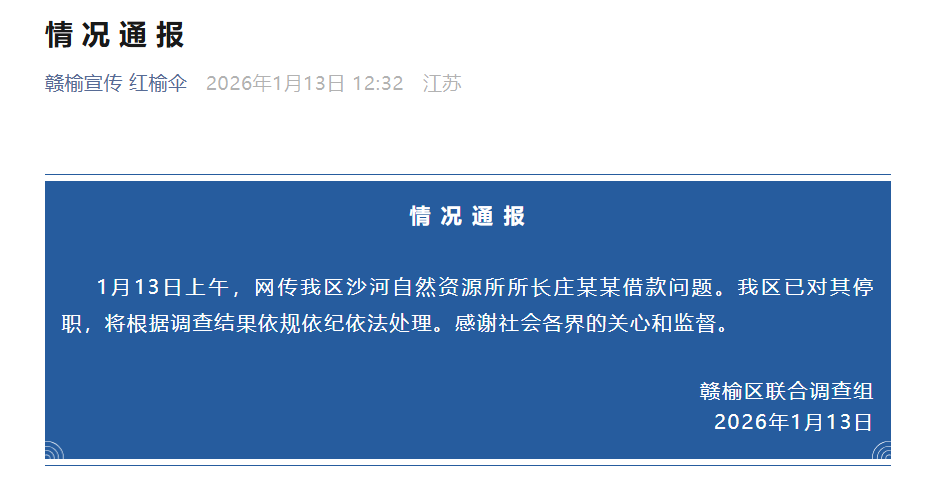 1月13日上午,网传我区沙河自然资源所所长庄某某借款问题。我区已对其停职,将根据调查结果依规依纪依法处理。感谢社会各界的关心和监督。
